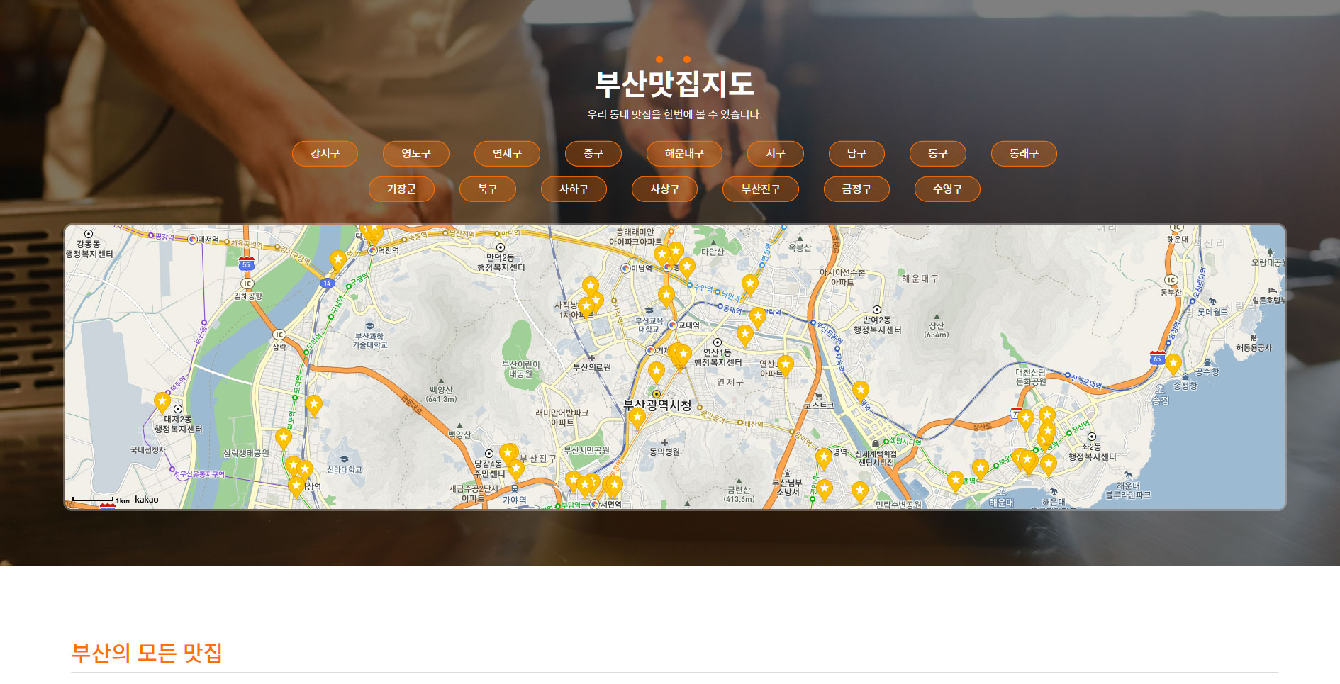 부산의 구,군 별로 리스트를 만들었고 레스토랑을 클릭하면 레스토랑의 정보를 보여줍니다. scss을 이용하여 style을 주었습니다.